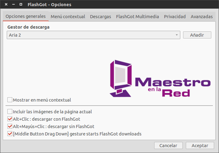 en Gestor de descarga se lo cambiamos a uGet , luego vamos a FlashGot Multimedia y igualmente seleccionamos uGet,damos a aceptar cuando lo tengamos listo,una vez hacemos esto si volvemos al navegador veremos que se nos a añadido un nuevo icono